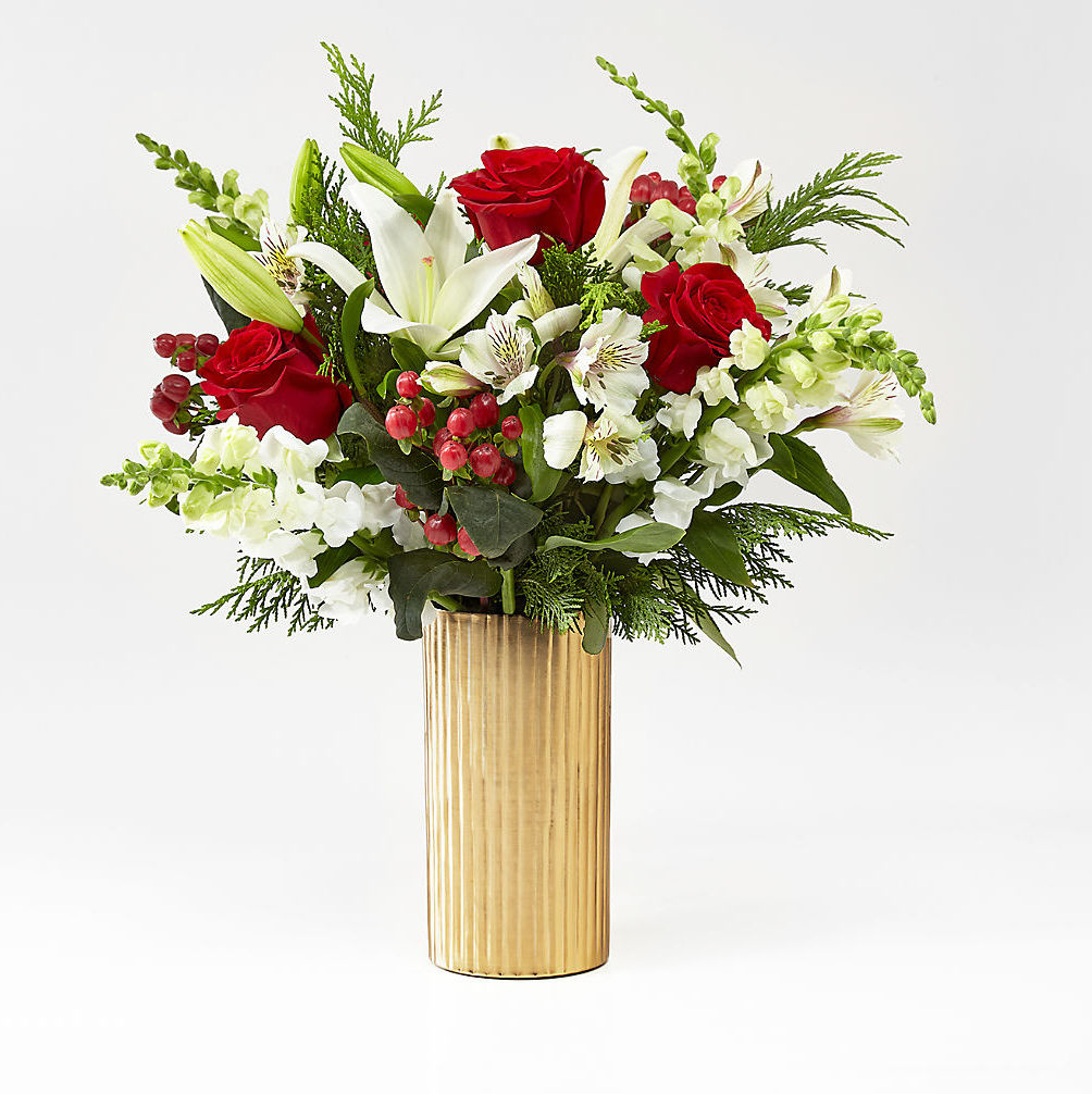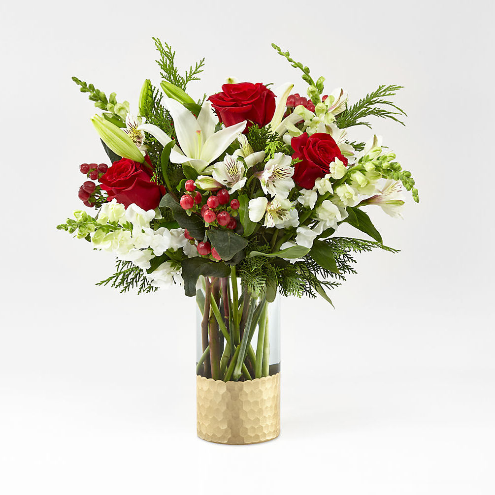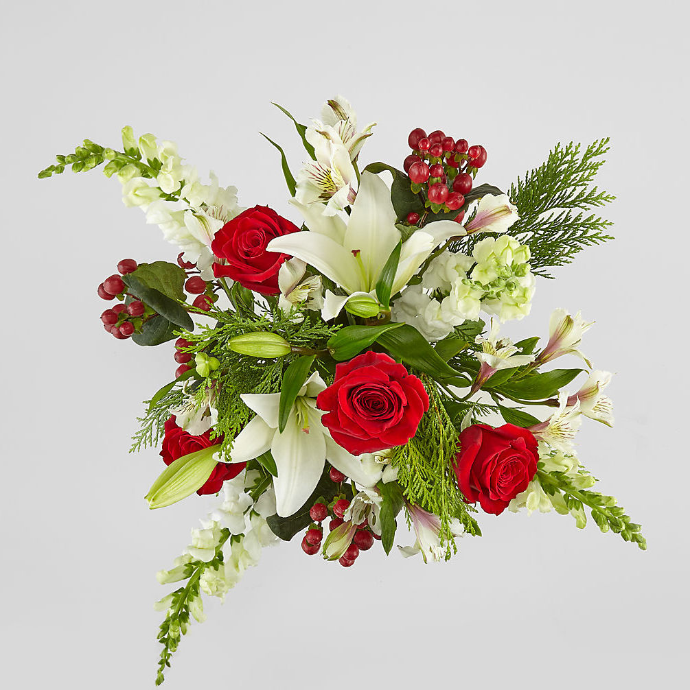A modern take on a holiday classic, this fresh Christmas bouquet comes with a collection of white and red flowers with assorted greens.
